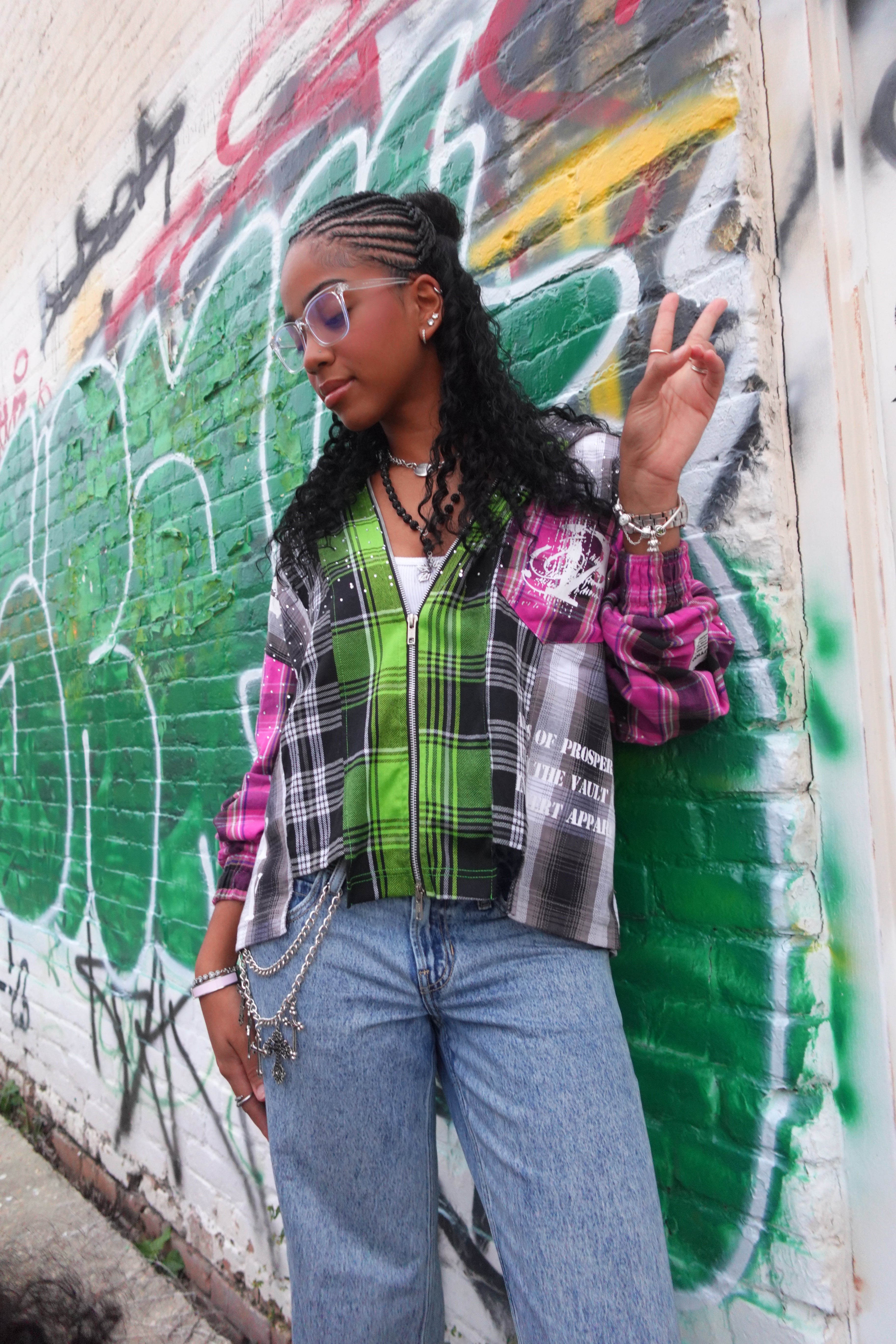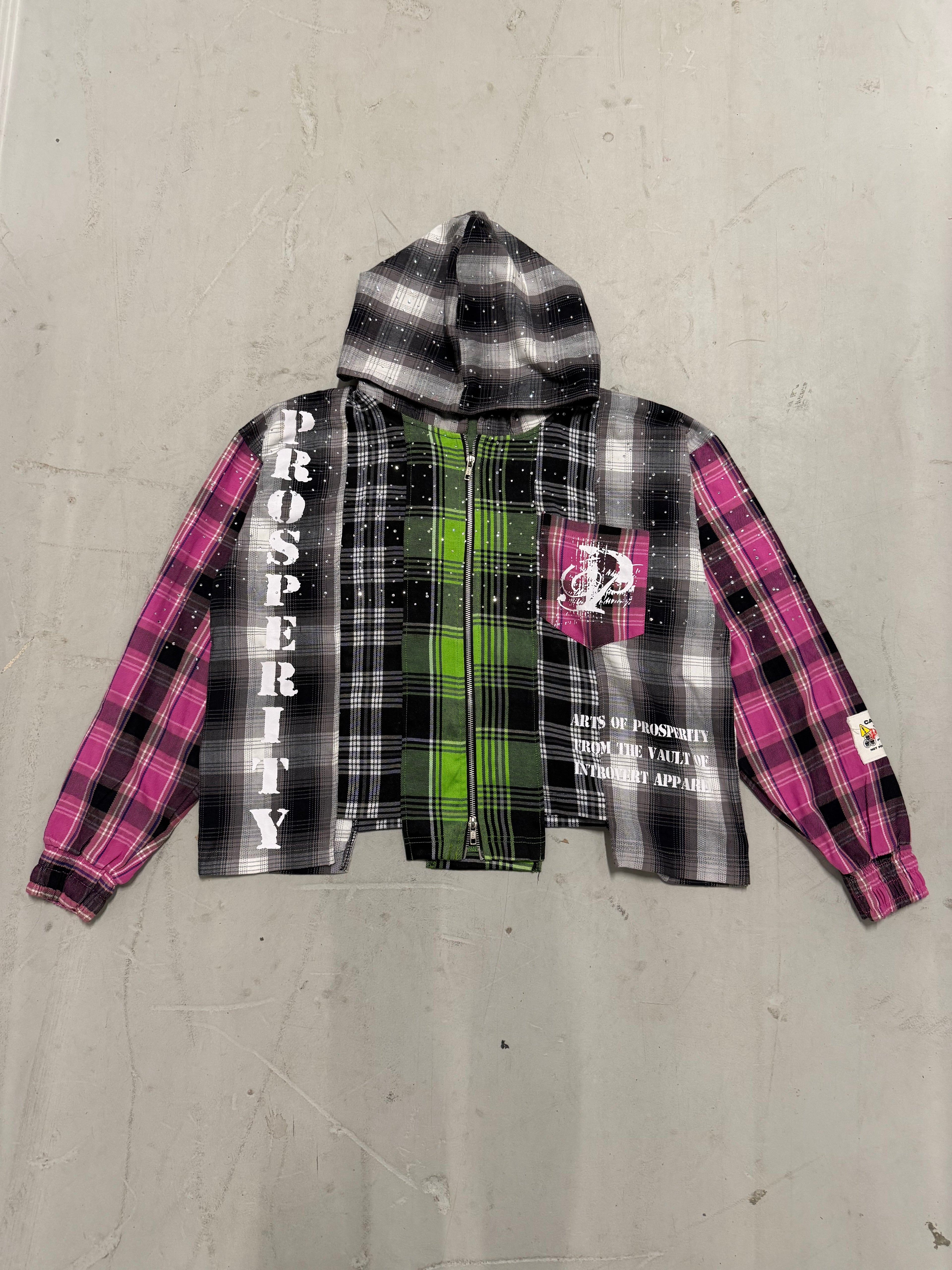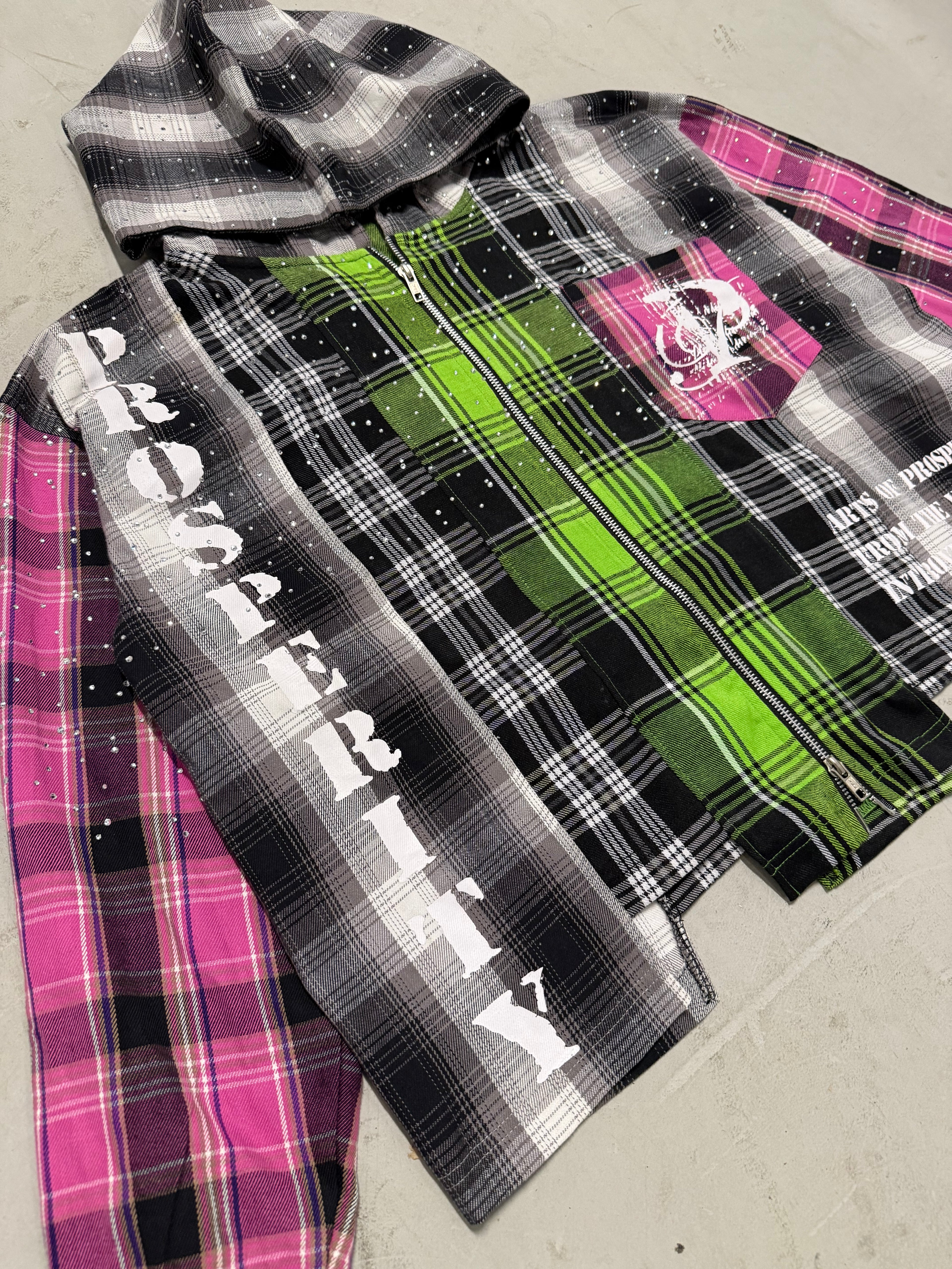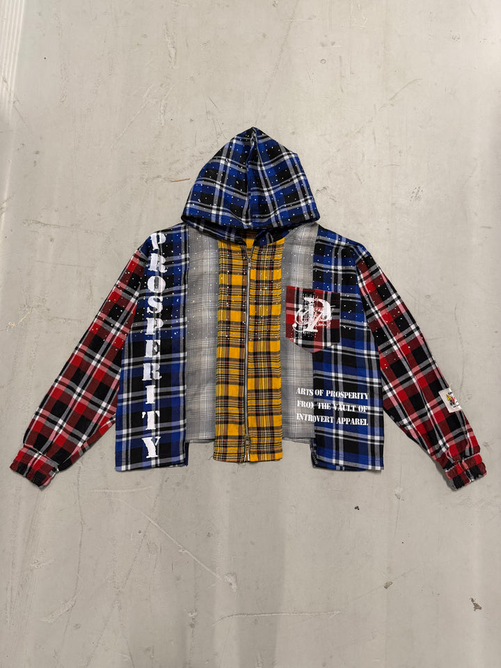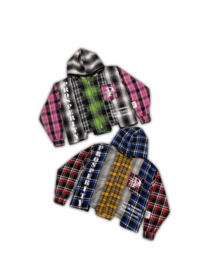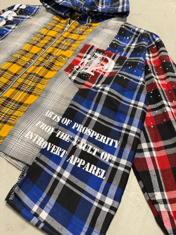 Each piece is uniquely assembled from vibrant plaid panels and detailed with powerful prints like “PROSPERITY” and “ARTS OF PROSPERITY FROM THE VAULT OF INTROVERT APPAREL.” This isn’t just outerwear — it’s wearable art. With oversized graphics, contrasting sleeve panels, and unexpected color clashes (think green on pink or yellow on royal blue), these zip-ups demand attention and deliver individuality.