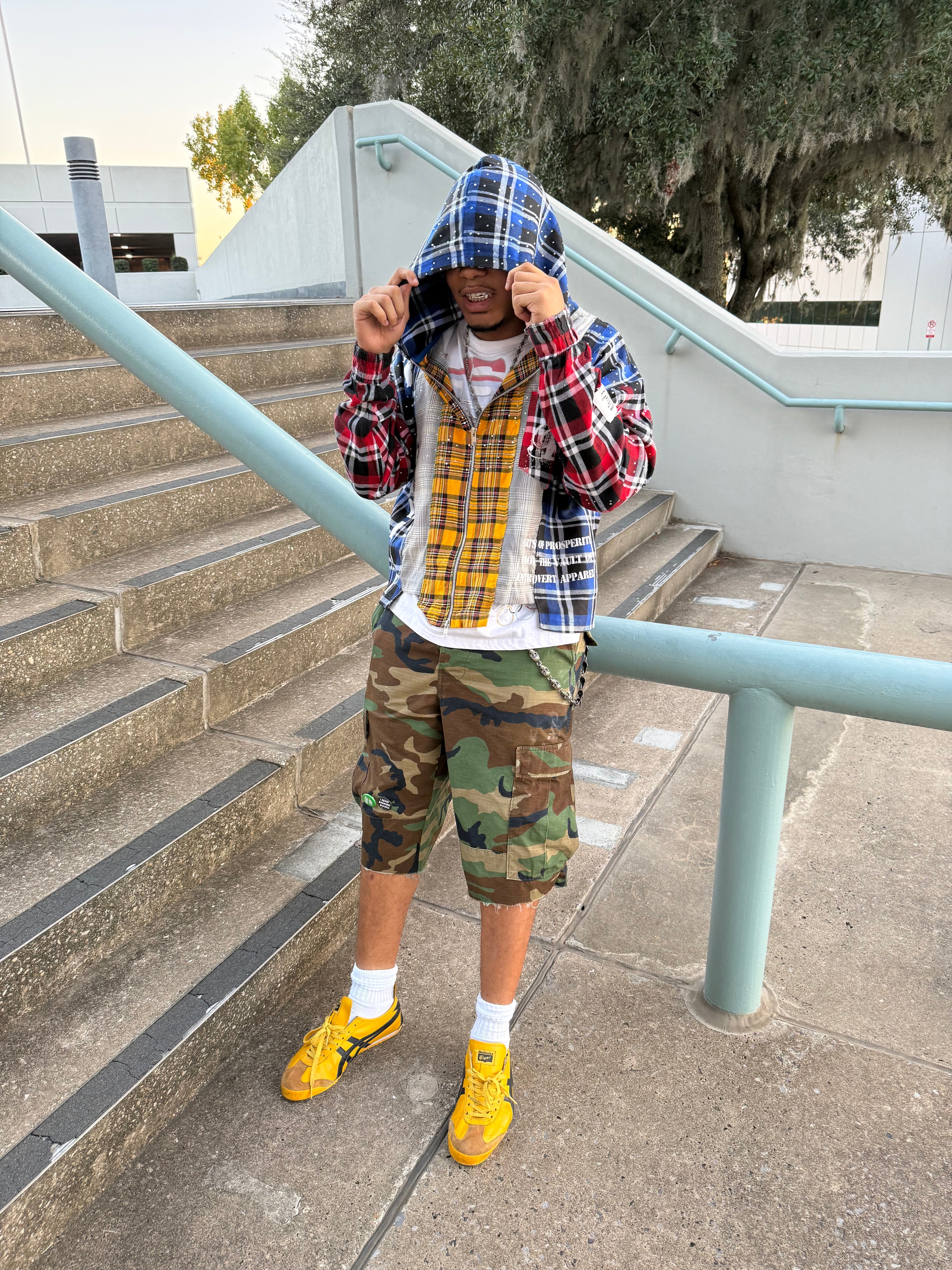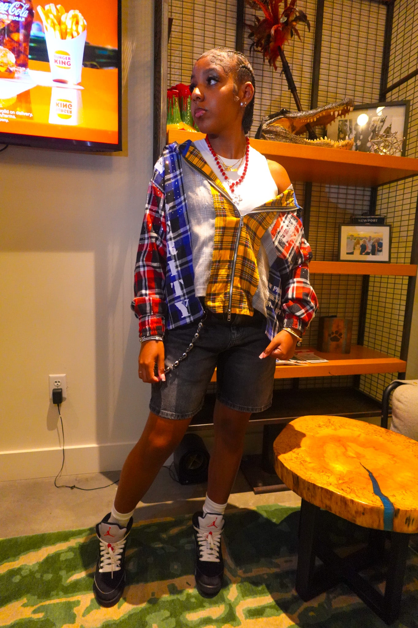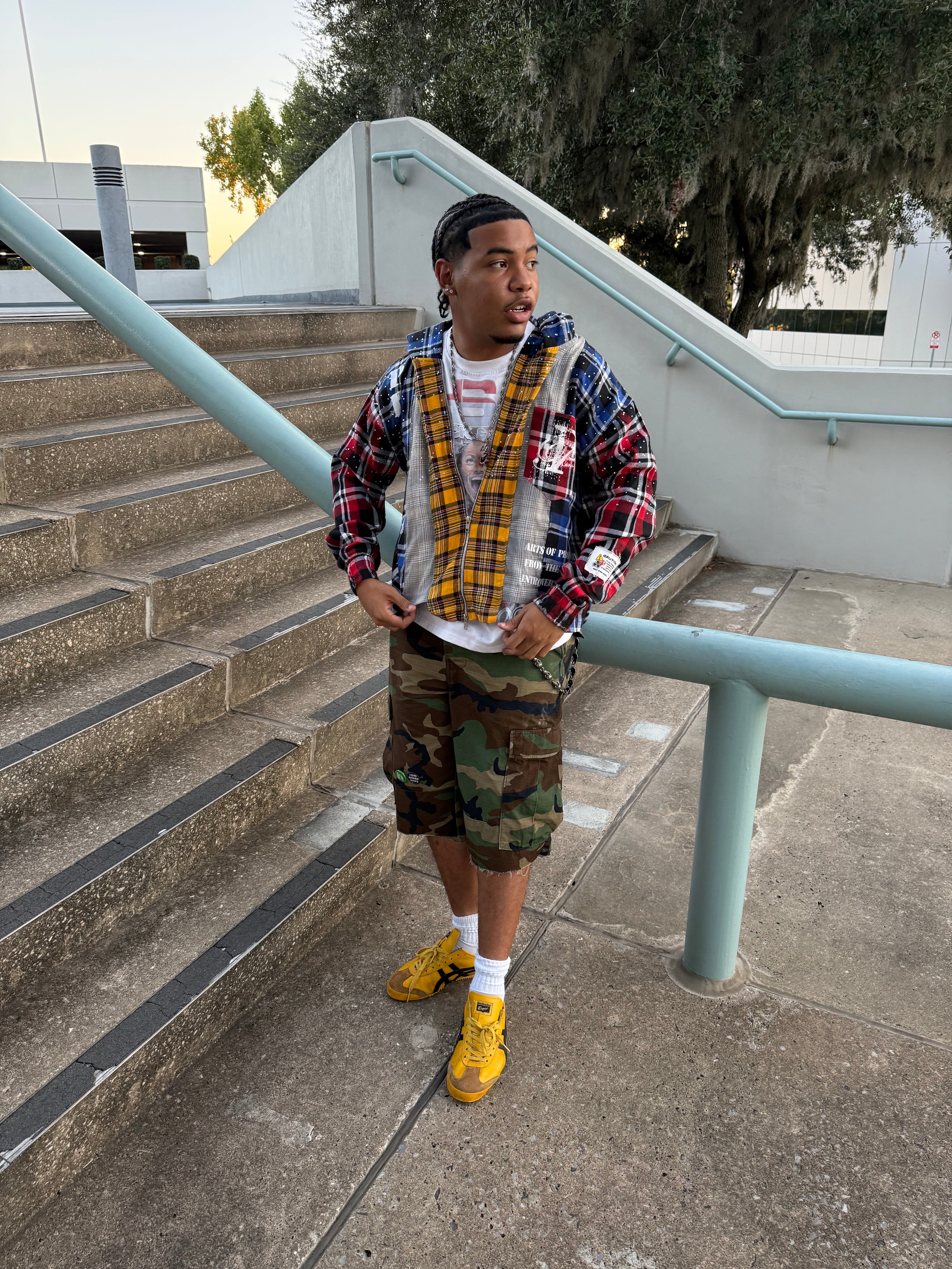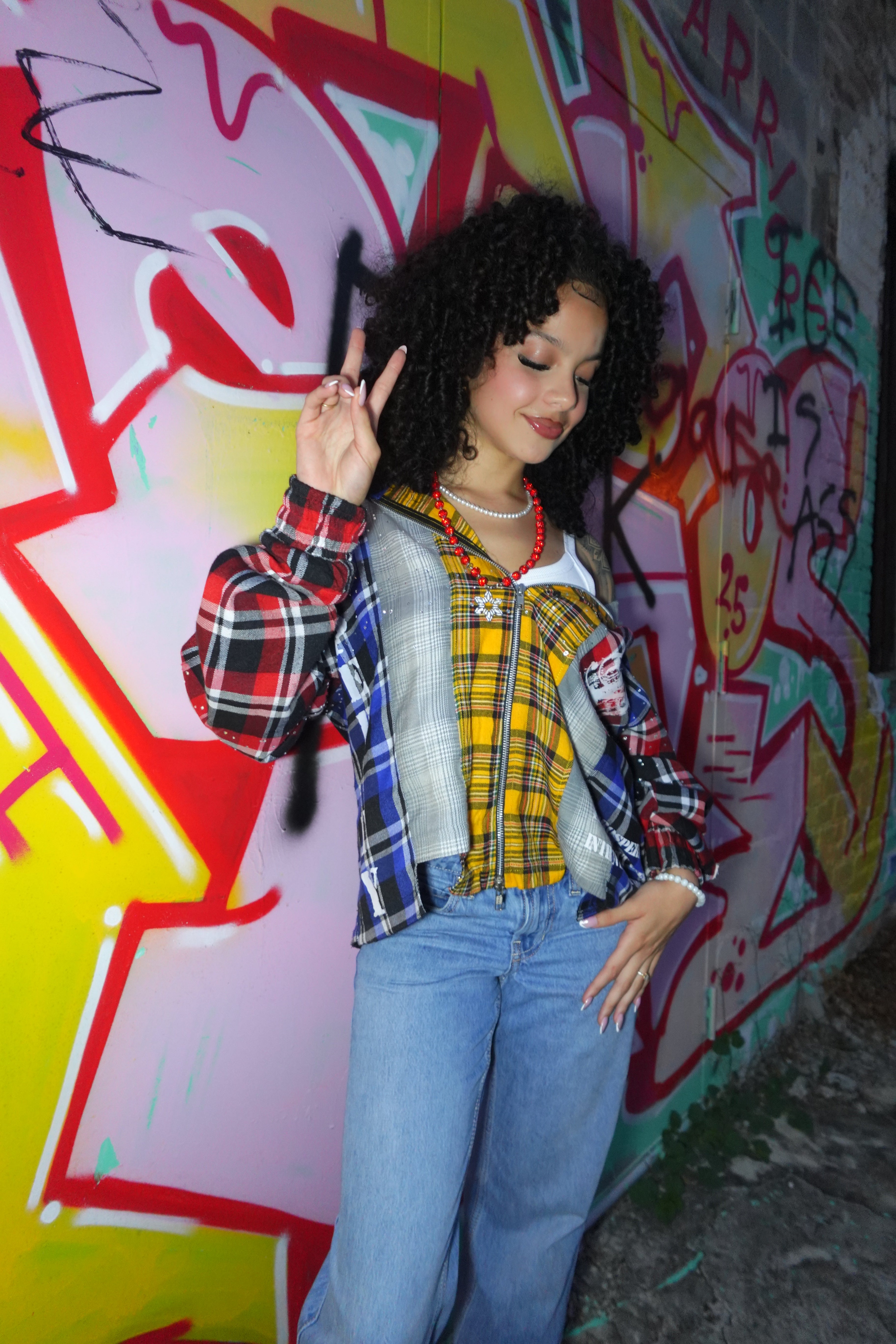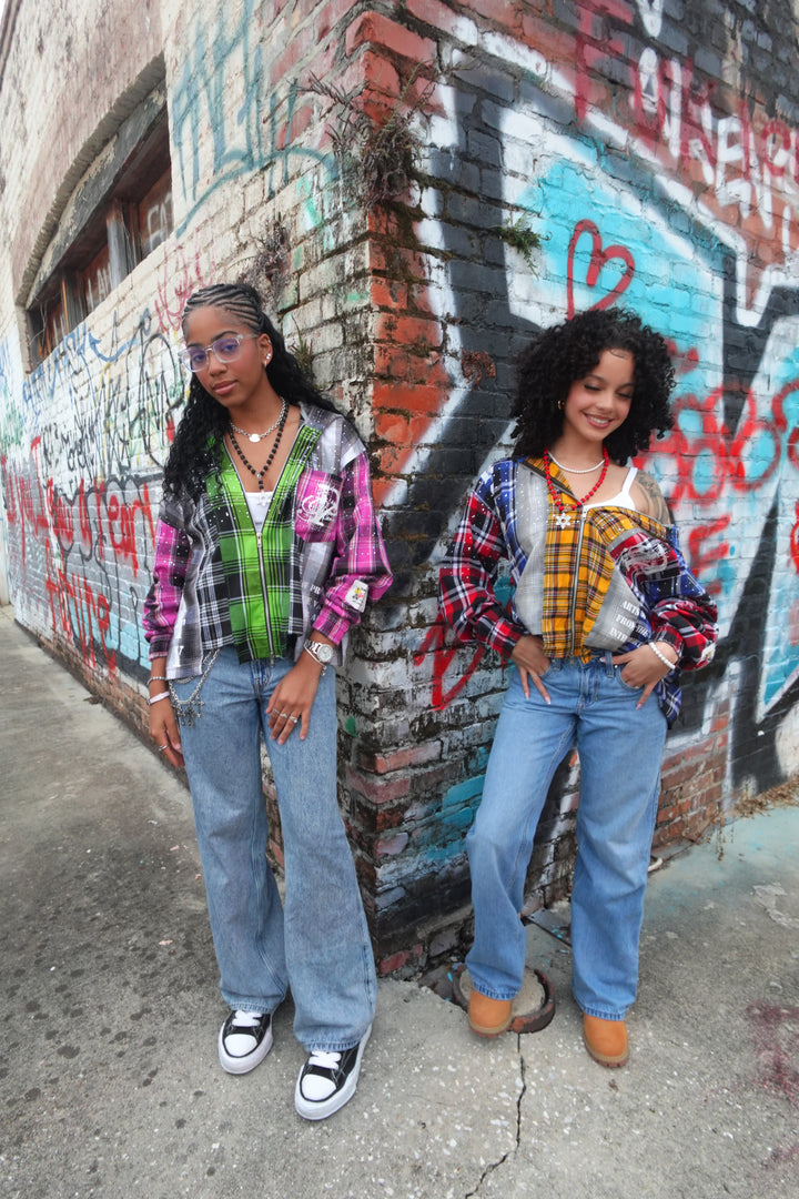 Each piece is uniquely assembled from vibrant plaid panels and detailed with powerful prints like “PROSPERITY” and “ARTS OF PROSPERITY FROM THE VAULT OF INTROVERT APPAREL.” This isn’t just outerwear — it’s wearable art. With oversized graphics, contrasting sleeve panels, and unexpected color clashes (think green on pink or yellow on royal blue), these zip-ups demand attention and deliver individuality.